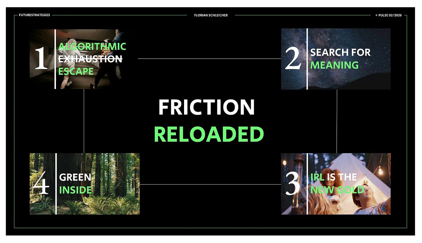 I highlighted and analysed four major changes in my latest trend report, FRICTION RELOADED – Marketing Trends 2026.