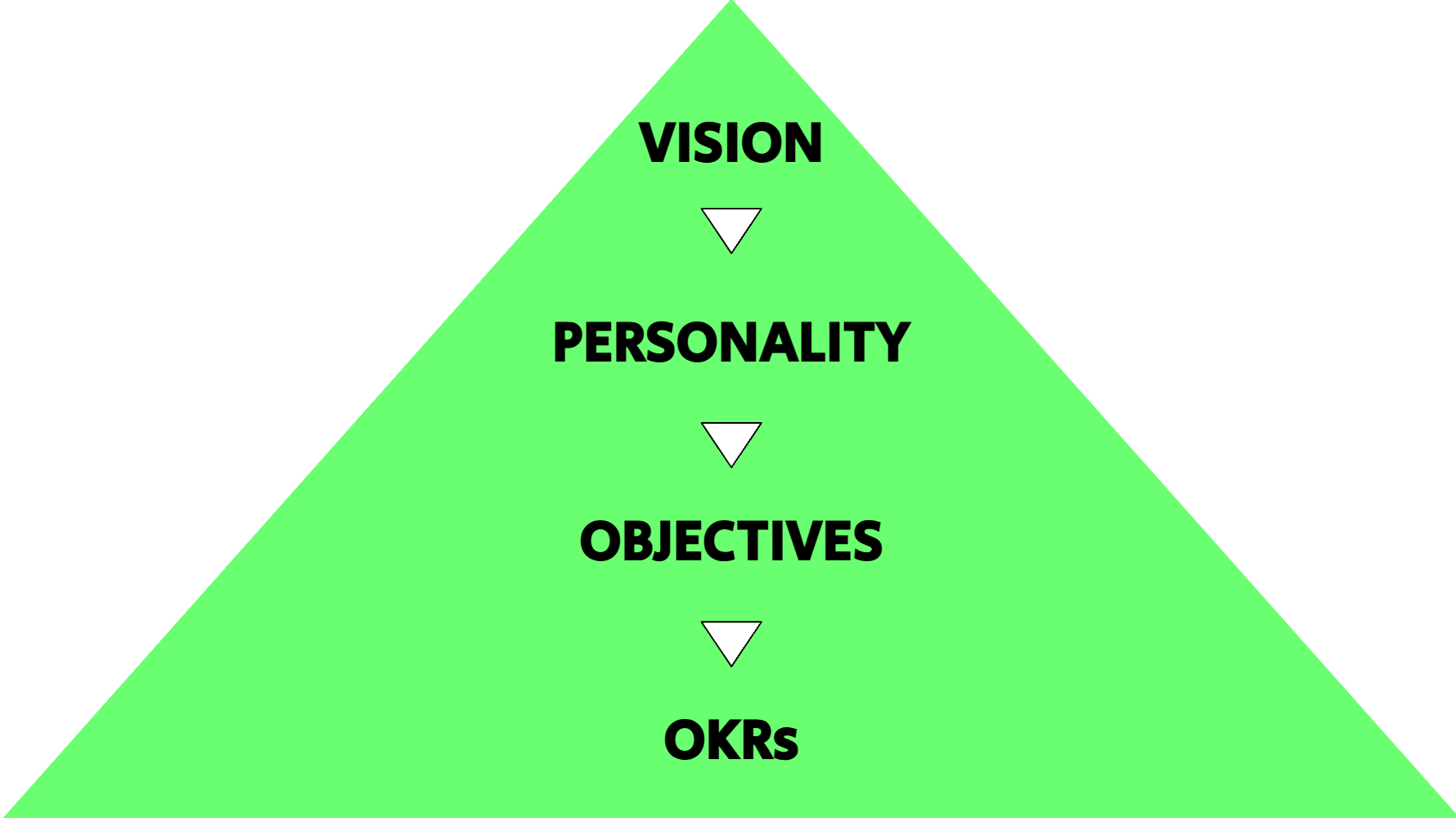 I always start at the top of this pyramid and derive the brand’s personality, goals and OKRs from the vision.
